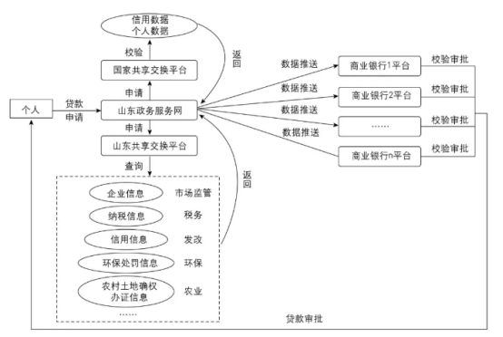 (二)2.0融合模式进入后工业时代,企业逐步向信息化、数字化转型,业务及生产经营数据变化速度加快。政府治理能力面临挑战,需要对企业所有生产活动和业务活动数据进行准确及时的分析,利用大数据提升科学决策能力、社会监管能力、公共服务能力和应急管理能力。2.0模式是指政社数据以接口方式进行融合应用。这种模式也分为两类,一类是数据的比对核验,另一类是API授权方式。比对核验方式是目前政府向社会开放数据的延伸,是将政府内部的查询核验数据的功能拓展到了社会领域。为确保数据安全,政务数据在和社会数据对接时,通过政府或企业平台进行联通,将数据需求申请发送政府或企业数据共享平台,由平台对数据进行核验后给出验证结果。API方式通常用于政府或事业单位获取企业数据,通过API调用企业数据,将其与政务数据进行融合,然后进行开发利用,这种方式确保了数据安全,企业是无法接触到政府数据的。以数据比对核验为例进行说明。为解决小微企业融资难问题,山东省政府打通部门内部数据孤岛,促进政务数据与银行数据进行对接共享,极大提升了企业贷款成功率和办理效率(参见图1)。山东省级政府首先将市场监管局、税务局、发改委、环保厅、农业厅所掌握的企业信息、纳税信息、信用信息、环保处罚信息、土地确权办证信息,通过省级共享交换平台进行共享,并通过国家共享交换平台进行信用数据、个人数据核验,验证通过之后,将数据推送给各商业银行,由银行依托各自数据平台对所有政务数据与自身掌握的企业数据进行对接,核验校对成功后即可批准个人贷款办理申请。在这种模式下,政府数据和企业数据通过银行的数据平台进行了对比验真。