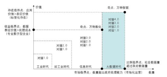 (三)数据融合的双维度奇点分析在4个临界点的交点处,会形成2个奇点。一是万物数化的奇点,即市场临界点和收益临界点对应的位置。在这个奇点,数字成为社会万物存在的主要形态,物质本质越发表现为数字化,政府将把数据的运营交给专业的数字化公司,企业通过数据不见面、模型算法见面的方式,将政务数据与企业数据进行对接融合,开发新产品和服务,满足政府和社会的需求。二是万物智联的奇点,即比例临界点和存在临界点对应的位置。这个阶段数据融合的模式,将克服只有模型算法见面的制约,不同应用场景并不需要单独开发不同的模型算法,各数据使用方均可通过具有共性的数据特征进行政务数据和社会数据的融合利用,数据完成了标签化存在,同时,万物数化也随之晋级为万物智联(参见图3)。